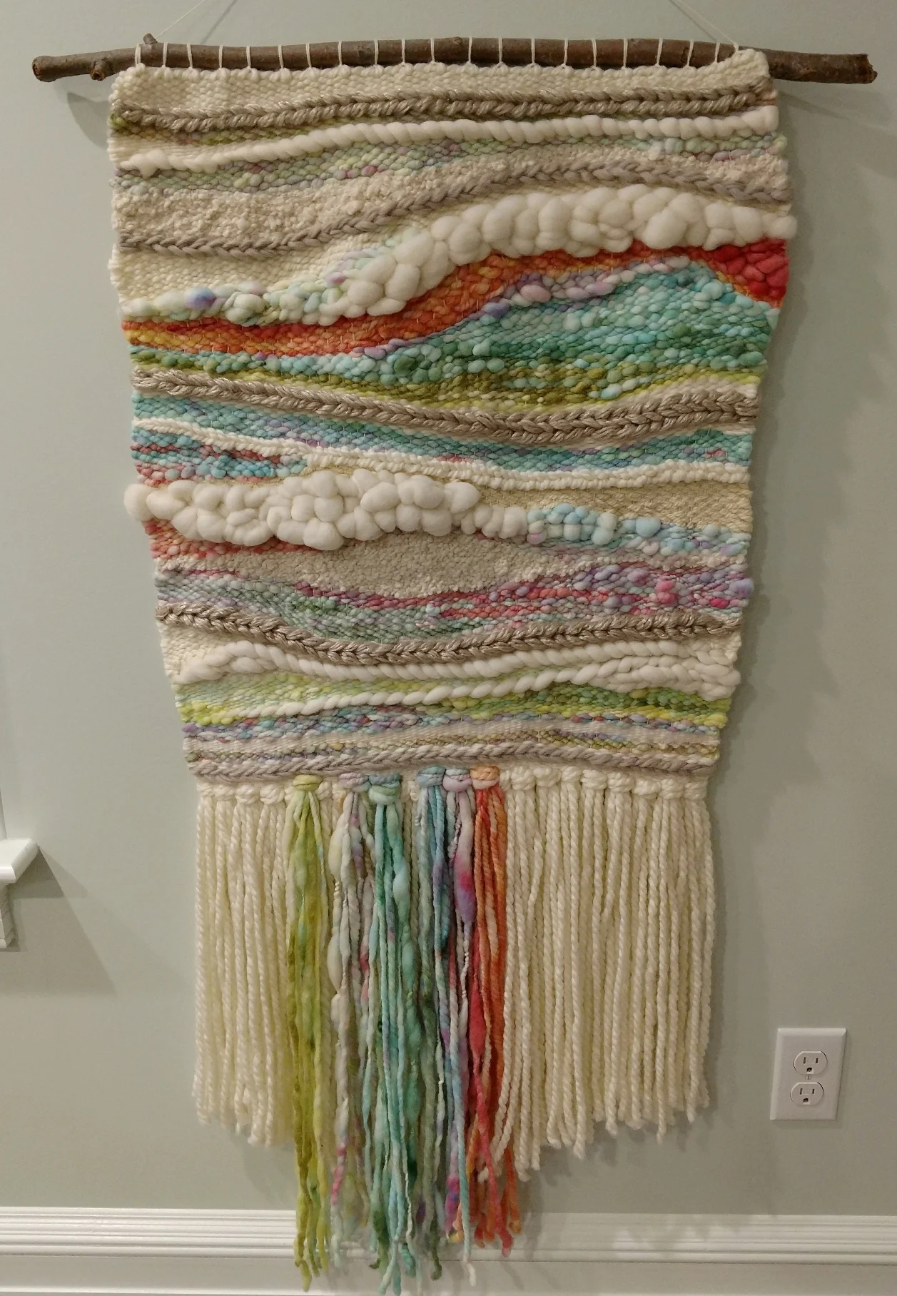 I highly recommend using a relatively plain worsted weight or thinner yarn for the first few rows of weft, and weaving a plain weave, or tabby weave, for several rows. The plain weave is literally: over one thread, under the next. On the next row, go under the threads you went over last time, and over the threads you went under before. This will help give a nice selvedge edge to your hanging.